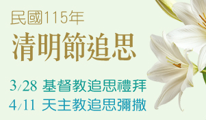專為基督教徒舉行的追思禮拜,讓聖經與詩歌的禮讚,撫慰親朋好友們的身心靈,共沐在聖靈的光輝祥和之中。
